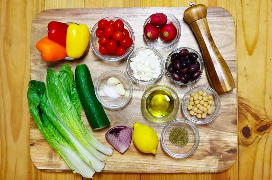 | Томаты | Огурцы | Болгарский перец | Лук репчатый | Сыр Фета | Маслины без косточек |