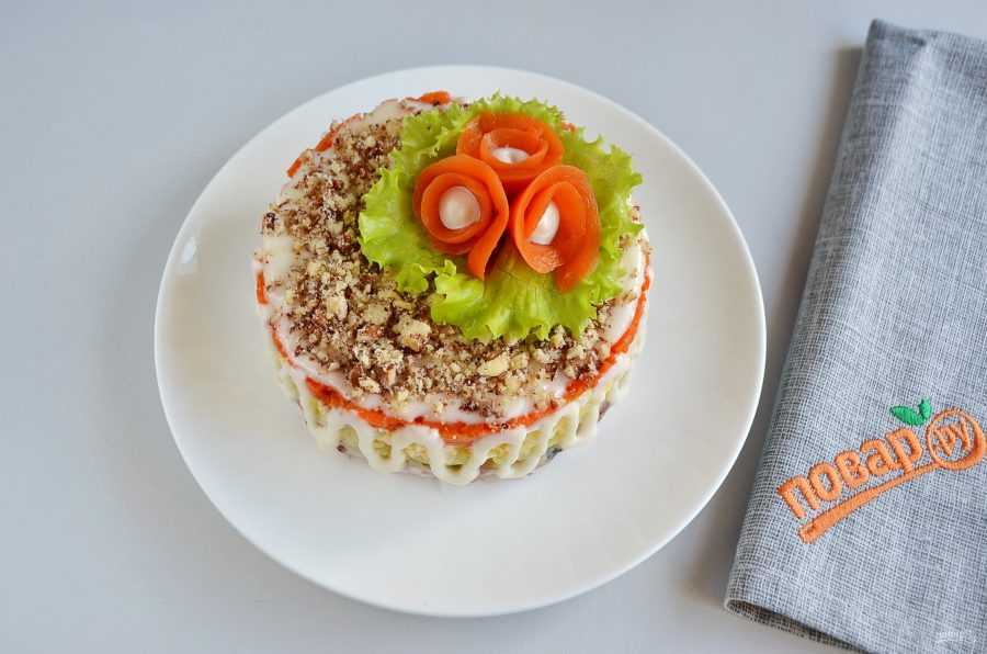Эдакий вариант для пробуждения аппетита! Салат с селедочкой, луком, картофелем, морковью и яйцами. Изюминка — грецкий орех! А в заправке мы смешаем горчицу с майонезом. Выкладываем слоями, используя сервировочное кольцо, или прямо в прозрачную миску. Салат «Фаворит» вкуснее, когда настоится. Украшаем вареной морковью и молотыми орешками.