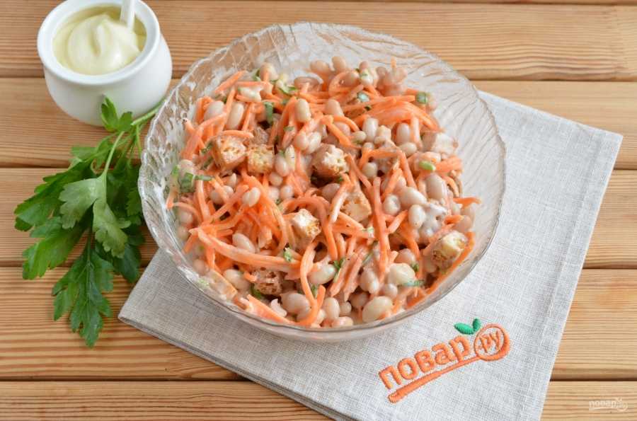Вкус салата создают консервированная фасоль, морковь по-корейски и кириешки. И он неповторим! Это салат — на скорую руку. При желании вы можете добавить чеснока и больше зелени, а также экспериментировать с разным вкусом кириешек. По виду простой, но на самом деле очень оригинальный и вкусный мужской салат как для праздничного, так и для будничного стола.