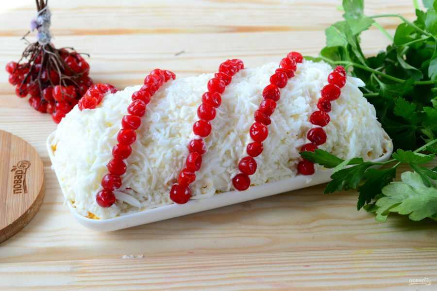 Необычный салат и оригинальная подача! Тертый белок и ягоды калины (по желанию — клюквы или граната) скрывают набор из вареной куриной грудки, консервированной кукурузы, крабовых палочек, чипсов, яиц. Выкладываем салат слоями, перемазываем майонезом. Сомневающиеся крабовые палочки могут опустить. Приготовьте и угостите своего любимого!