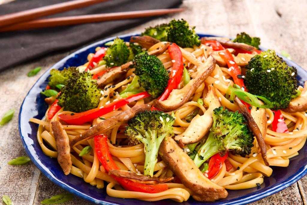 Курица с овощами под соусом терияки с фунчозой