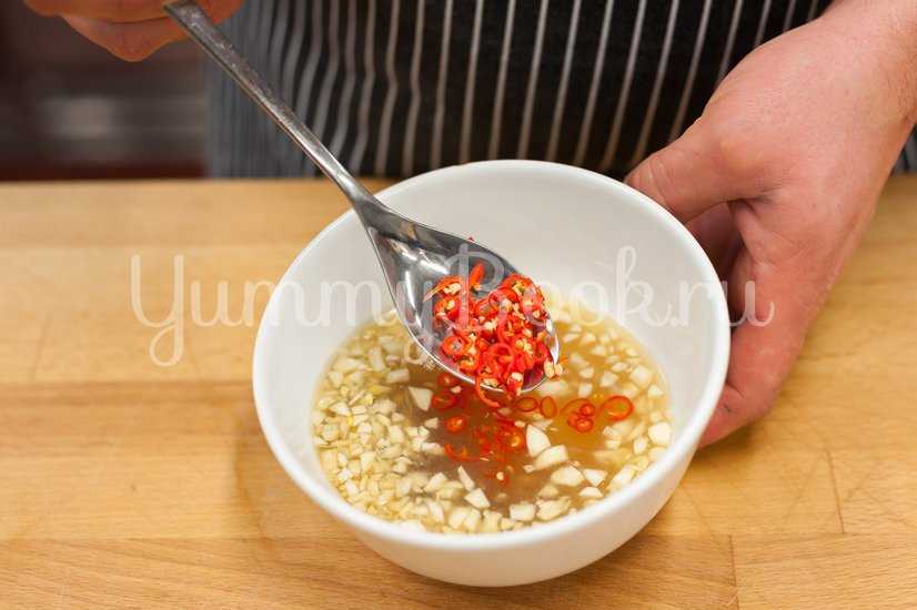 Приготовить соус: соединить продавленный чеснок, рыбный соус, сок лимонов и измельченный перец чили. Поставить соус в холодильник.