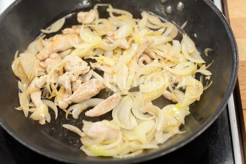 Курицу нарезать длинными полосками, посолить и поперчить и обжарить на сковороде около 5 минут. Добавить нарезанный полукольцами белый лук. Обжаривать еще 2 минуты и затем снять с огня.