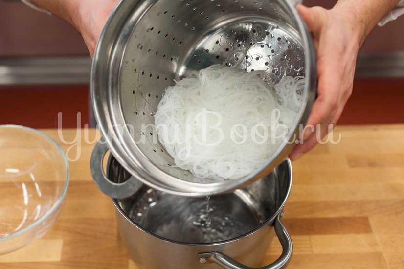 Рисовую лапшу приготовить согласно инструкции на упаковке (обычно достаточно залить ее кипятком на пару минут), затем промыть лапшу под холодной водой, процедить и отставить.