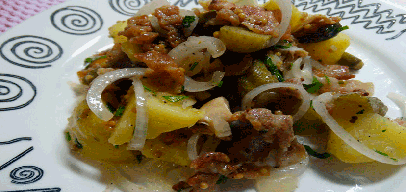 - Тщательно все перемешиваем и подаем на стол. Такое блюдо лучше употреблять горячим, пока бекон и картофель не остыли. Хотя и в холодном виде закуска получается отменной.