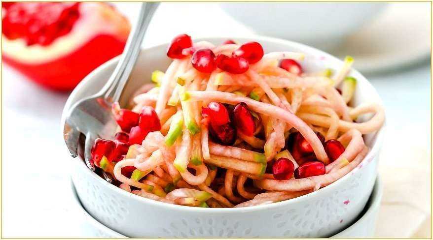 Салат из черной редьки с грецкими орехами имеет интересный вкус, ведь сочетание остроты корнеплода и сладости изюма дает неповторимый результат. Заправка из меда, лимонного сока и дижонской горчицы не даст скучать вашим вкусовым рецепторам.