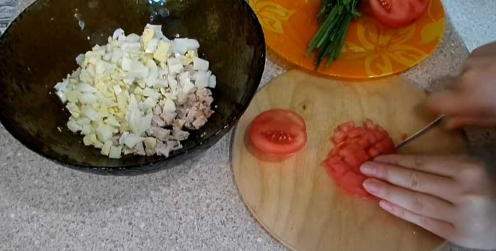 - Все имеющиеся ингредиенты соединить, заправить майонезом с чесночными «нотками», вымешать.