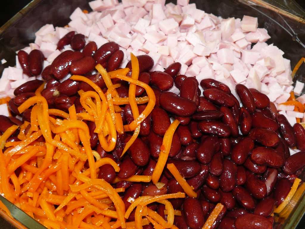 Готовим домашний салат с колбасой, фасолью и сухариками